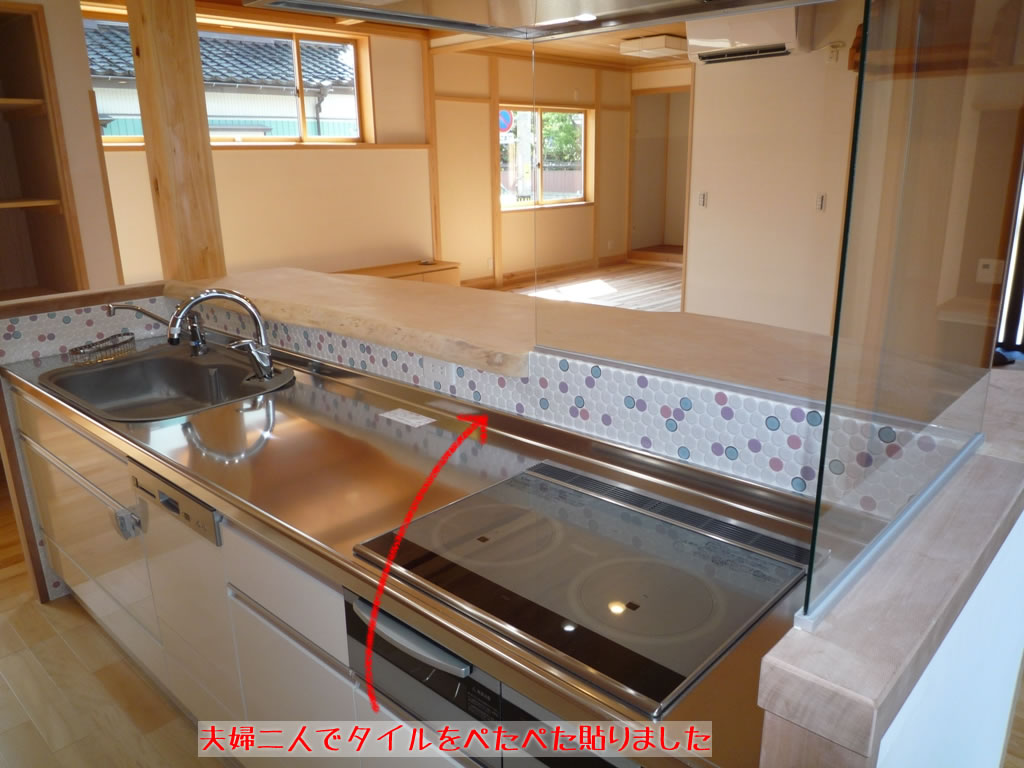 魚津産の杉をふんだんに使い、外断熱通気工法で人と自然に優しい家 お施主様に漆喰をぬりぬり、タイルをぺたぺたしていただきました。